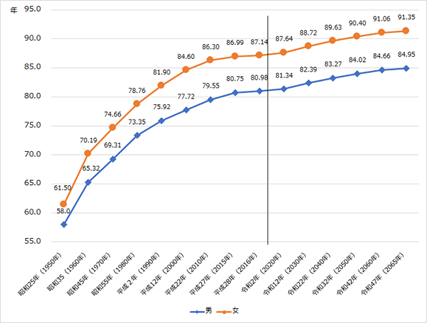 これは、当時の経済白書が「もはや戦後ではない」と宣言した1955年前後から、現在、さらには2065年までの予想される日本の平均寿命の推移を表したグラフです。急激な平均寿命の延びを見ていると、戦後の医療を担ってきた先人たちの努力に頭が下がる想いです。国民皆保険が始まったのは1961年、池田内閣が前年に発表した『所得倍増計画』が始まった年で、1964年の東京オリンピックに向けて、国全体が活気に満ちていた時代です。日本は若く、人口も増え続けていました。そのため、当時設計された医療制度は、